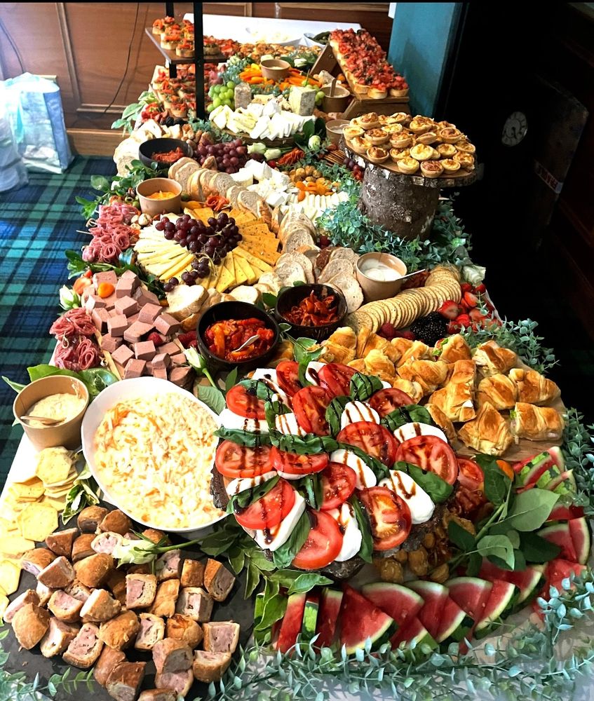 bruchetta, caprese salad, olives, sundried tomatoes, fresh fruit, cheeses, meats, pate, pickles, dips and much more